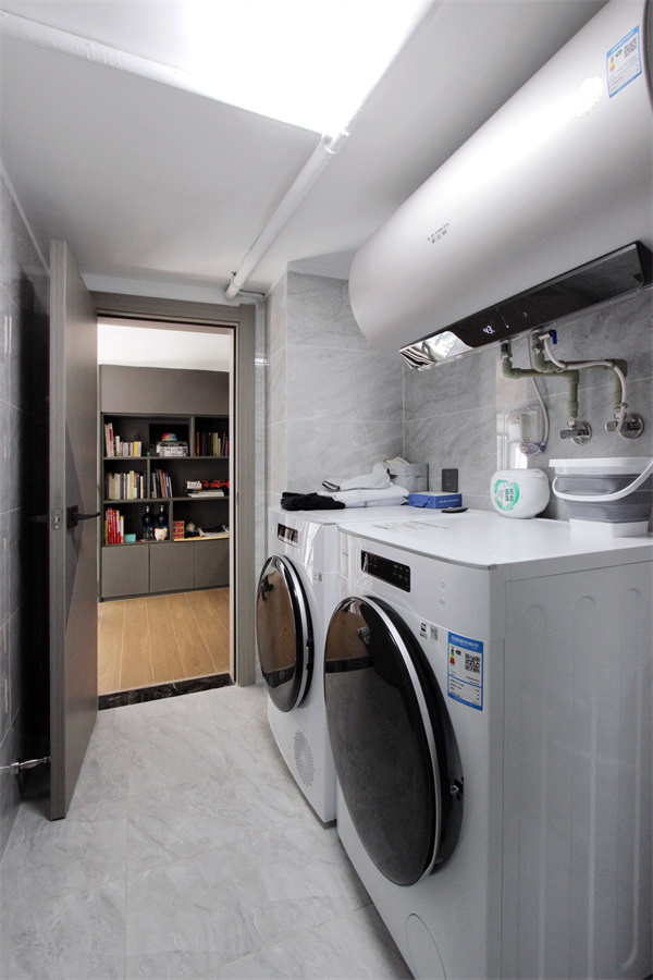 從飄窗臺一側的樓梯上去,是位于一層半的娛樂空間,里面擺放著業(yè)主精心收藏的精致手辦與書籍。過好日子必然少不了洗衣晾衣,陽臺是用來休閑的,那么洗衣房一定必不可少了,滿足了洗衣烘干功能的洗衣房,再也不用擔心衣服亂糟糟的晾曬而影響美觀了。