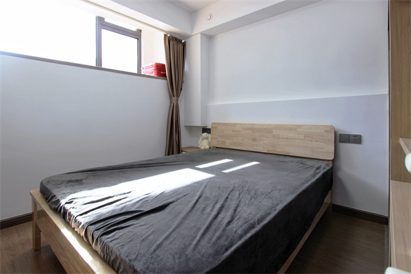 二樓為次臥,一半的窗戶雖然給采光帶來一絲不便,但卻能夠做到很好的收納作用。原木與灰色,更加純凈自然,利用簡單的留白,打造簡約的臥室空間。