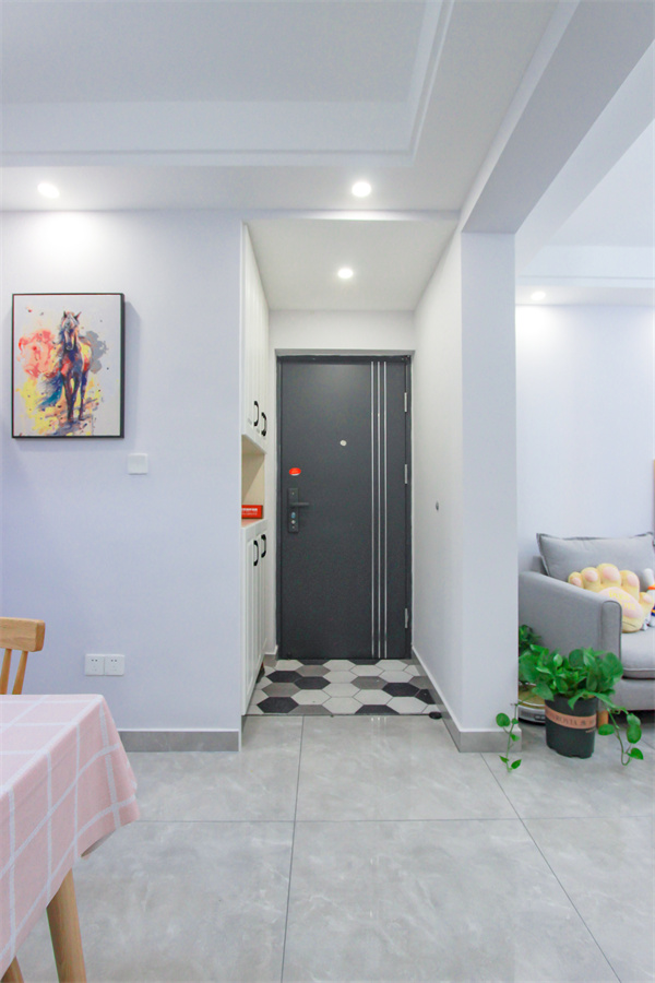 玄關花磚造型,將換鞋區域與內廳分割,白墻隔開客廳區域,分區明顯,白色收納柜與整體色調統一。