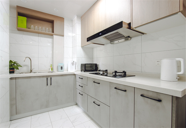 廚房空間收納充足,使廚房空間整潔統一。玻璃移門使空間更加通透寬敞,更加開放。