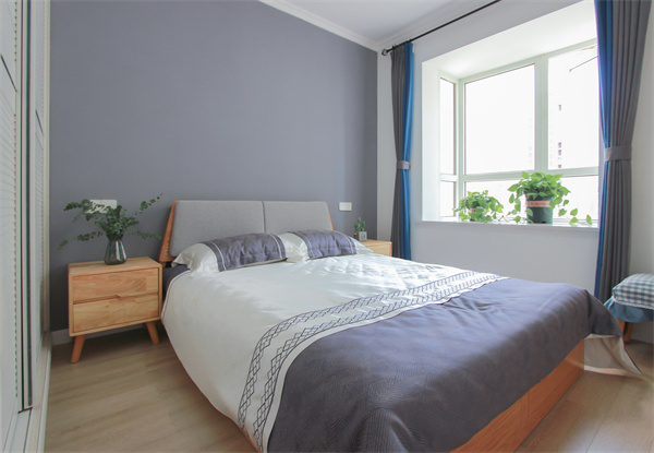 臥室的空間棱角用色塊區分,明朗的線條,簡約的裝飾,使空間更加立體。原木床頭柜搭配尤加利,給素凈的空間一抹綠意,營造質樸、清新的休憩空間。低飽和色調與原木的結合,有清冷的質感,讓空間靜謐而美好。