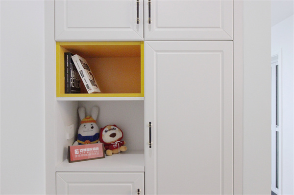 兒童房家具采用的是原木成品定制柜,兒童房更講究環保,原木質地更加原始自然。小小的衣柜讓孩子有自己獨立的儲藏空間,自由的安排自己的衣物。床頭一旁是學習書桌柜,床尾放置帶有抽屜的五斗柜,小小角落,大大用處。
