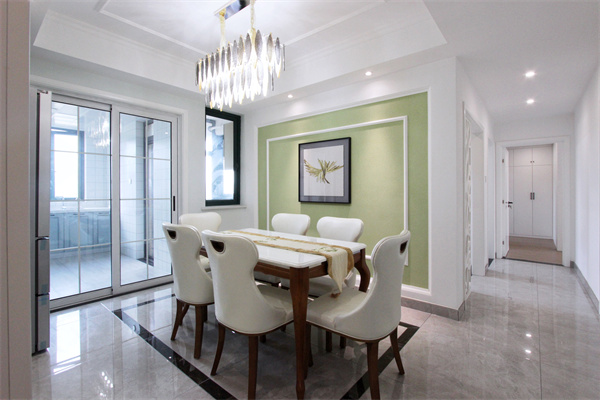 餐廳背景墻與客廳統一,加上一圈石膏線條修飾,更加協調,吊頂簡潔,以“線”接“面”。皮椅木腿,充滿了美式情調,通過燈光控制空間氛圍,彌漫出的是浪漫的氣氛。