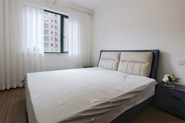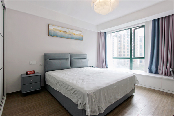 臥室空間給人一種寧靜、舒雅的感覺,可收納飄窗臺讓人有足夠的空間用來放松。簡潔的吊頂,無累贅的床頭吊燈,讓臥室成為純粹的休憩放松之地。