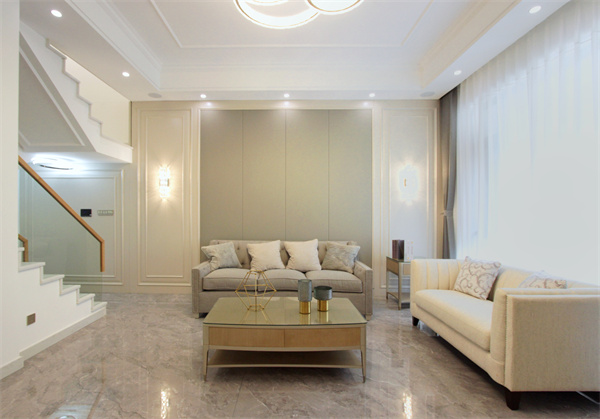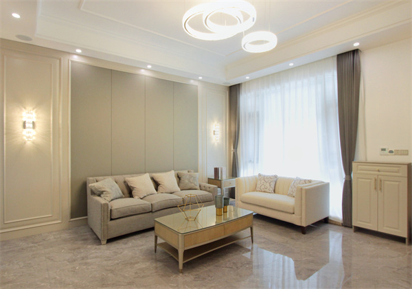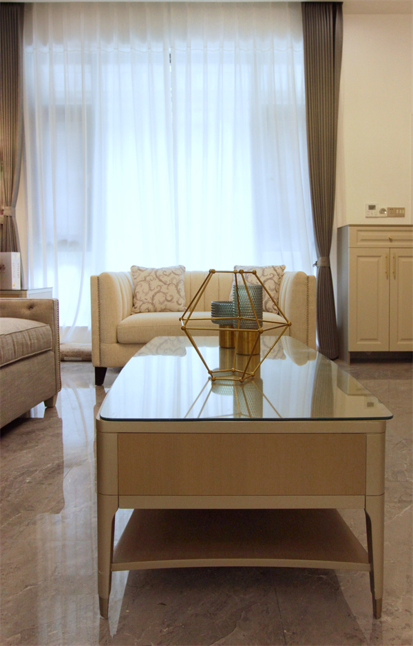 客廳空間以美式風格為基礎增添了簡約元素,整體色調選用奶茶色系,給人明亮、溫馨的感覺,也體現了女主人獨特魅力的釋放。