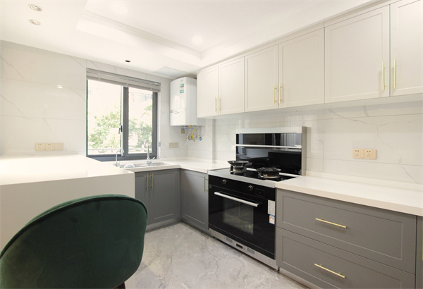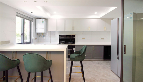 U型廚房設計布局,既節省了空間,同時也滿足了洗、切、炒、存的流暢動線。白色吊柜+灰色地柜,在滿足儲物需求的的同時也豐富了廚房空間的層次感,形成視覺上的清爽干凈,在規整有序的環境中讓下廚烹飪也更加方便。