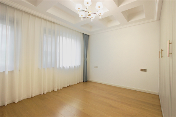 業主為女兒將來的孩子預留一間兒童房做備用,是休息的地方,也是可安心玩耍的童趣領域。大白墻+木地板的經典搭配,白色提亮空間,木色散發著自然氣息,二者結合,簡單又溫馨。靠墻位置打造衣柜,大大增加了兒童房的收納空間。另外在兒童房與主衛之間安裝長虹玻璃門,透光的同時也具有私密性。