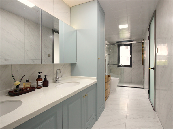 主衛采用一字型布局設計,顯得更加寬敞舒適。清新的淺藍色,營造了一個自然的浴室環境。雙臺盆設計,滿足兩人同時洗漱。鏡柜+浴室柜組合,分類收納不凌亂,提升浴室收納力。利用主衛墻面空間,設計壁龕,可以放置日常洗漱用品,拿取更方便。