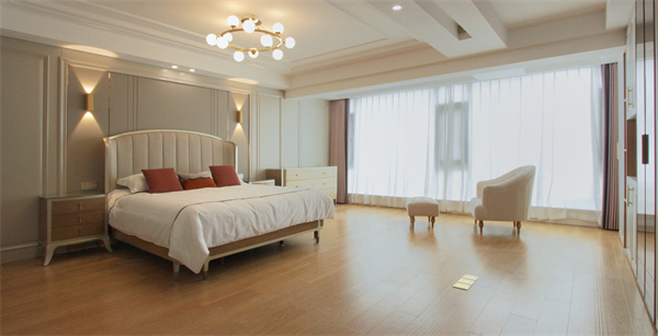 超大落地窗讓主臥空間更顯寬敞明亮,擺上兩張休閑單椅,變成一處愜意的休閑區。角落打造安靜的閱讀區,陽光灑進來,一杯咖啡,一本書,可以坐一下午。