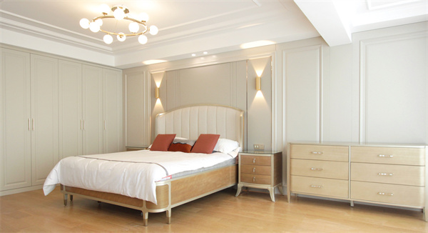 美式實木抽屜柜,有序安放大小物件,實現大容量分類儲物。抽屜柜與床頭柜相呼應,利用好的材質提高整個空間檔次。