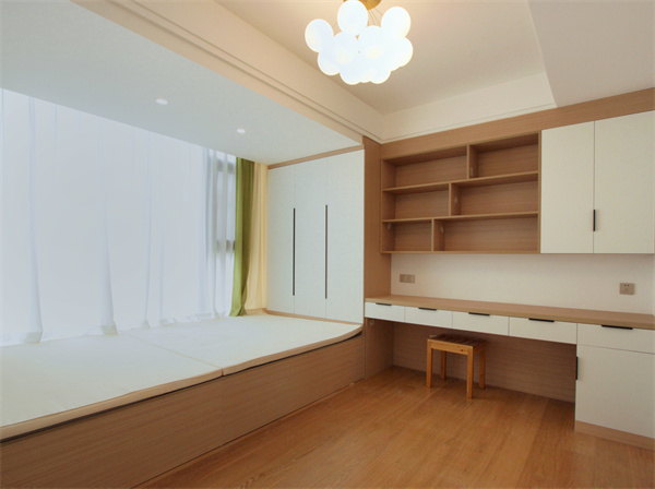 書房采用榻榻米床+衣柜+書架一體化設計,既能提供大量的儲物空間,又能創造個性與休閑的家居氛圍,美觀實用兩不誤。L型的布局方式可以更好地完成衣物、書籍和零碎物品的收納,還能提高整體空間的利用率,塑造簡潔干凈的空間感。