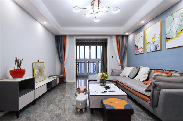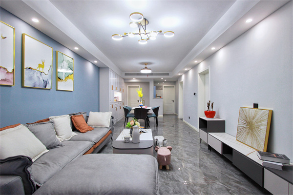 客餐廳一體,天藍色的沙發背景墻用色使客廳清新明亮,動線干凈利落,層次分明。高純色彩,簡潔吊頂,柔軟自然的配飾,讓人想窩進沙發里放松一下。