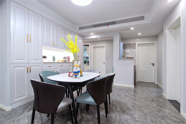 客餐廳以餐邊柜分開區域,格局更加明朗,活動空間也較為充足。廚房靠近入戶們,而餐廳則靠近入戶走道,通透明亮的純白質地,是餐廳空間的主旋律。餐邊柜是整面墻的收納柜,利用空間優勢做足了收納的同時,又為不同空間做出了區別。中空設計加上感應燈帶處理,讓開放格更有藝術感,也為生活增添了些許時尚。