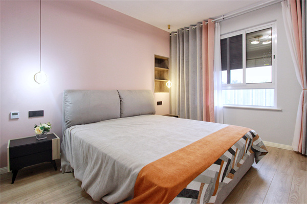 粉色床頭墻面搭配暖色燈光,給臥室蒙上了一層靜謐溫暖的格調。床頭位置的壁龕設計,是躲在墻里的收納,充分利用空間的同時,又顯得十分特別。圓形造型的吊燈給素凈的墻面帶來線條造型感,衣柜移門設計在空間利用上更加便捷。