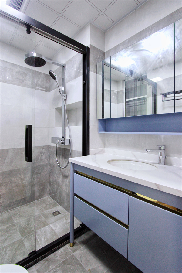 洗手區域衛生間分離,是孩子們的專用區域。半隔斷的設計,是洗手區成為一個半開放的空間。童趣的藍色調,讓孩子更加享受洗漱的時光,鏡柜的開放格等收納,更加便捷的放置孩子的物品。內衛更有私密性,功能更加全面,淋浴房壁龕設計,收納更加整潔。